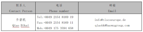 4.山西太鋼不銹鋼股份有限公司太鋼歐洲有限責(zé)任公司主要承擔(dān)歐洲市場(chǎng)太鋼鋼材產(chǎn)品的銷(xiāo)售,相關(guān)聯(lián)系人信息如下: