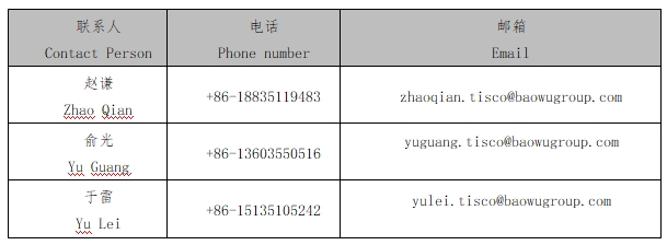 3.山西太鋼不銹鋼股份有限公司營(yíng)銷(xiāo)中心海外貿(mào)易部是本公司產(chǎn)品出口的唯一官方渠道,相關(guān)聯(lián)系人信息如下: